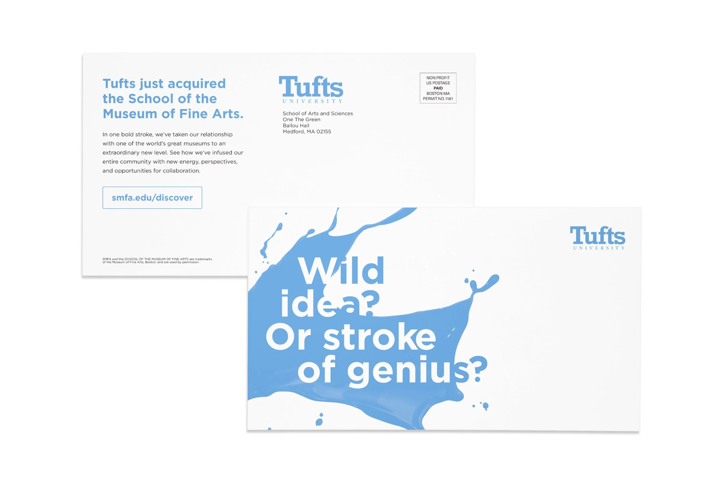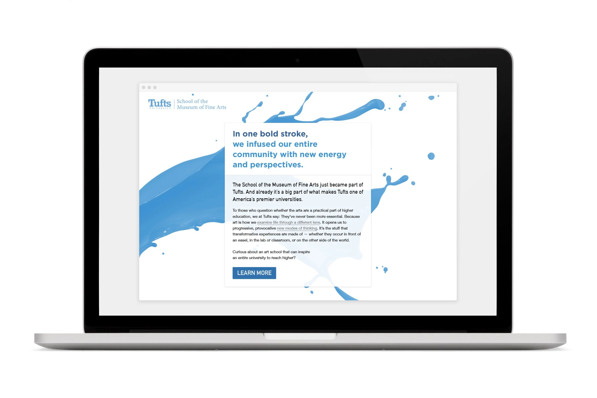 In a bold move, Tufts disrupted its portfolio of schools by acquiring and integrating an elite art school. The paint splash—set in Tufts signature blue—symbolizes bold artistic expression, and more literally, represents the moment in which the Tufts community was hit with a wave of artistic influence.